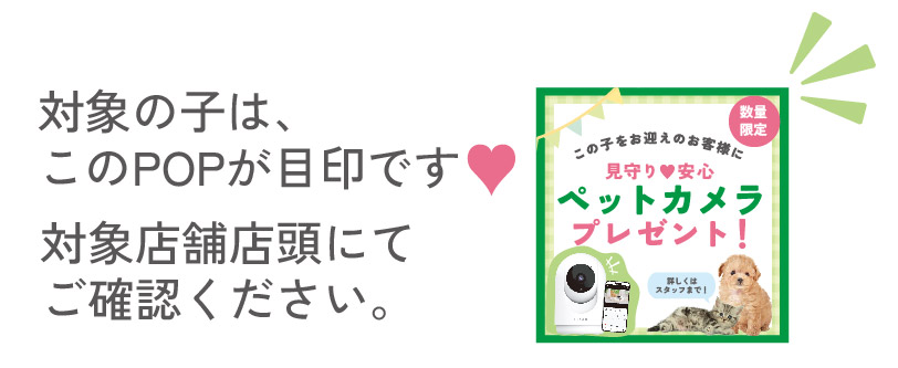 キャンペーン内容:対象のワンちゃん・ネコちゃんをお迎えのお客様にペットカメラプレゼント!