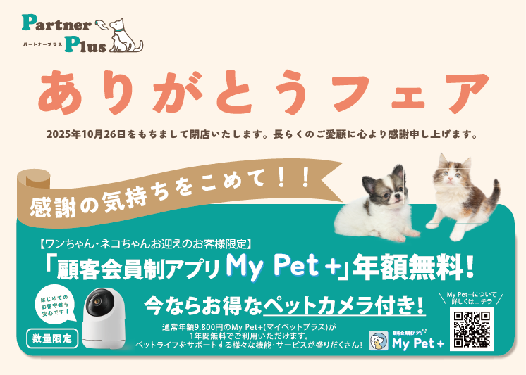 ワンちゃん・ネコちゃんをお迎えのお客様へ「顧客会員制アプリMyPet+」年額無料特典と、ペットカメラをプレゼント。数量限定となります。