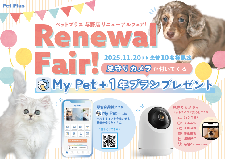 11月20日(木)よりリニューアルオープン記念して、ワンちゃん・ネコちゃんお迎えのお客様に見守りカメラ付き「My Pet+ 1年プラン」プレゼント!