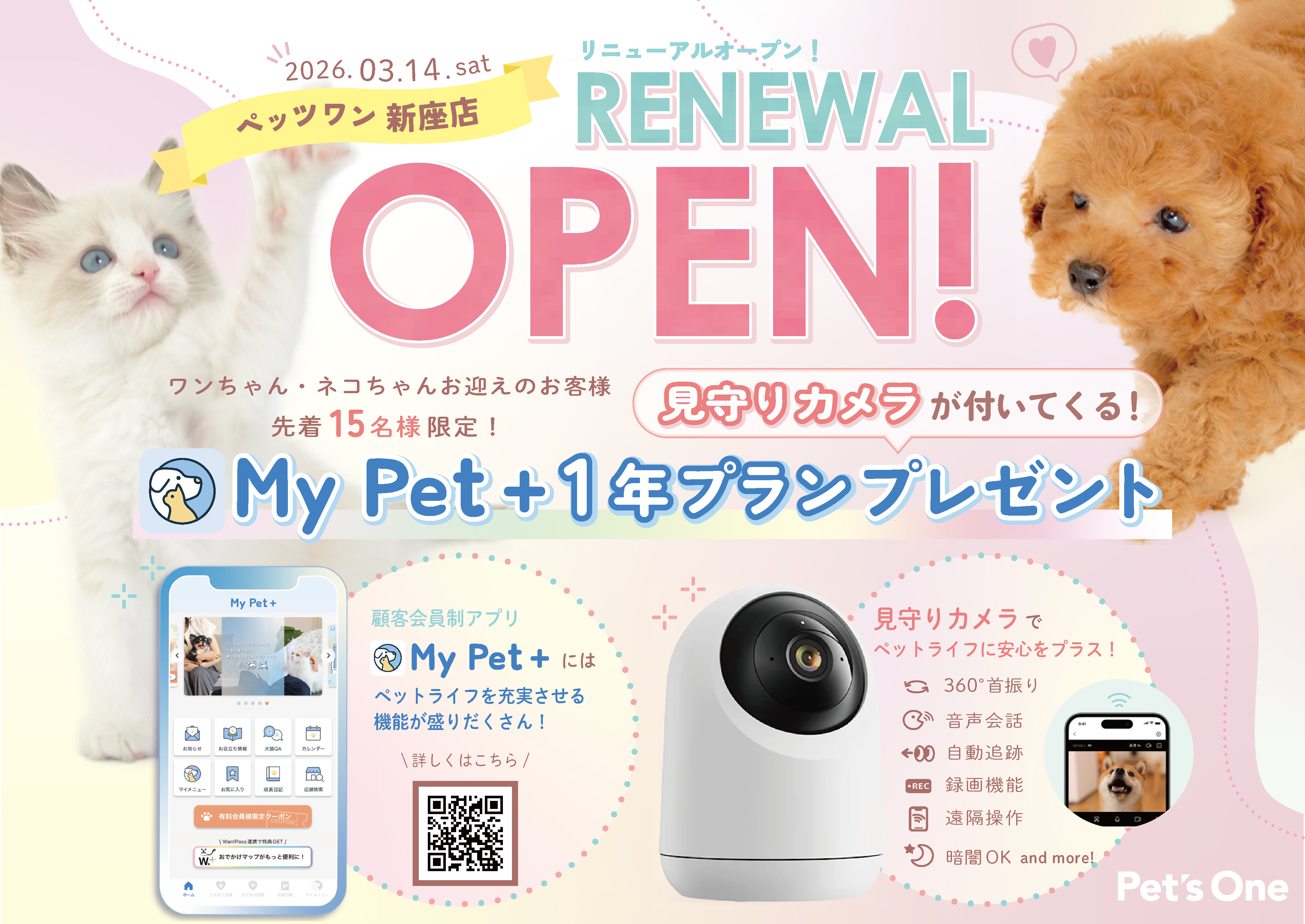 3月14日よりリニューアルオープン記念して、ワンちゃん・ネコちゃんお迎えのお客様に見守りカメラ付き「My Pet+ 1年プラン」プレゼント!