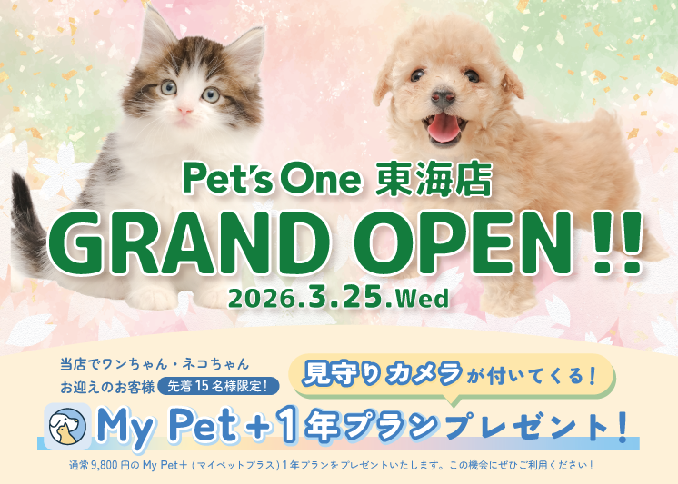 3月25日よりグランドオープンを記念して、ワンちゃん・ネコちゃんお迎えのお客様先着15名様に見守りカメラ付き「My Pet+ 1年プラン」プレゼント!